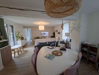 En rez de chaussée une entrée, un séjour double de 55m2 avec insert et accès sur une terrasse, une cuisine aménagée et équipée, 2 chambres, une salle de douche et un WC indépendant.
