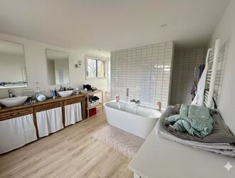 A l'étage 3 chambres, un dégagement et une salle de bains avec double vasque, baignoire , douche et WC.